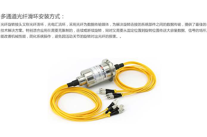 • · MFO1200C 12路光纖旋轉接頭(支持單模/多模)在進行360度無限制旋轉的時候無損傳輸數據。特別適合應用在需要無限制的,連續或斷續旋轉, 同時又需要從固定位置到旋轉位置傳送大容量數據、信號的場所,能改善機械性能,簡化系統操作,避免因活動關節的旋轉對光纖造成損害。
